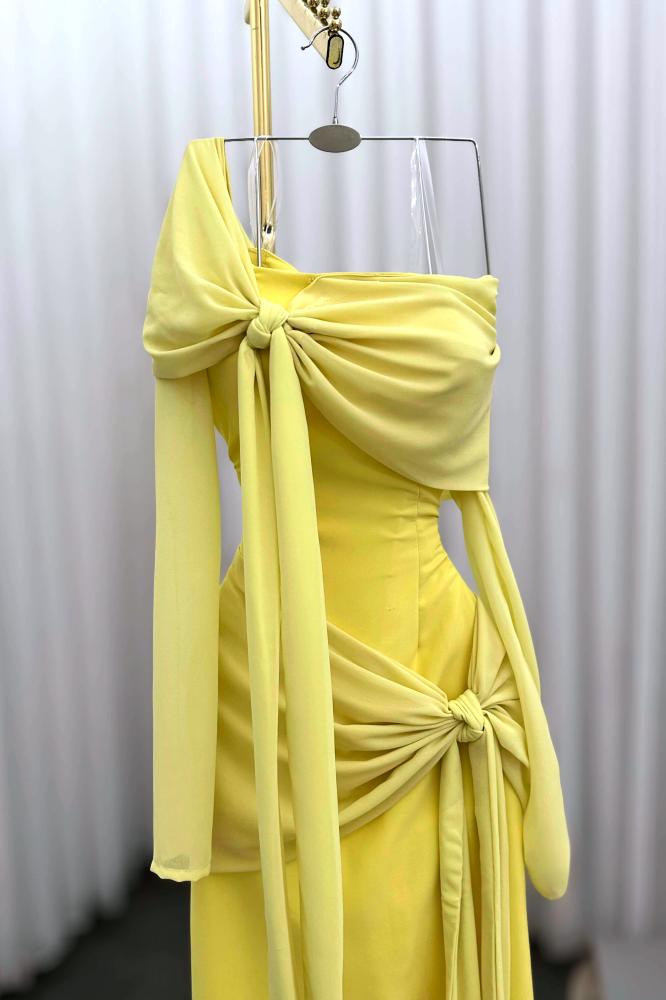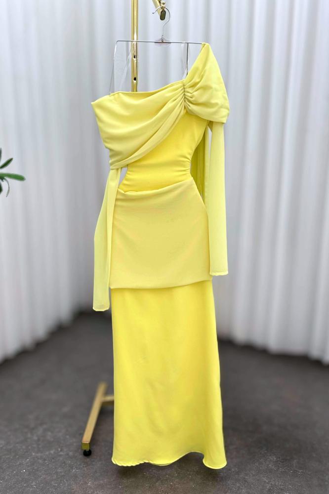 - فساتين سهره ليموني بتصميم أوف شولدر draped يمنحك لمسة أنثوية فخمة تبرز جمال الأكتاف والصدر.