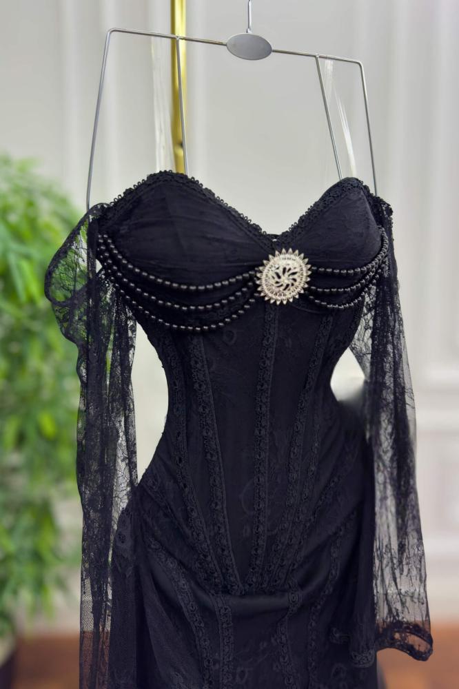 - التصميم: كورسيه محدد للخصر مع أكمام دانتيل واسعة وذيل ملكي.
