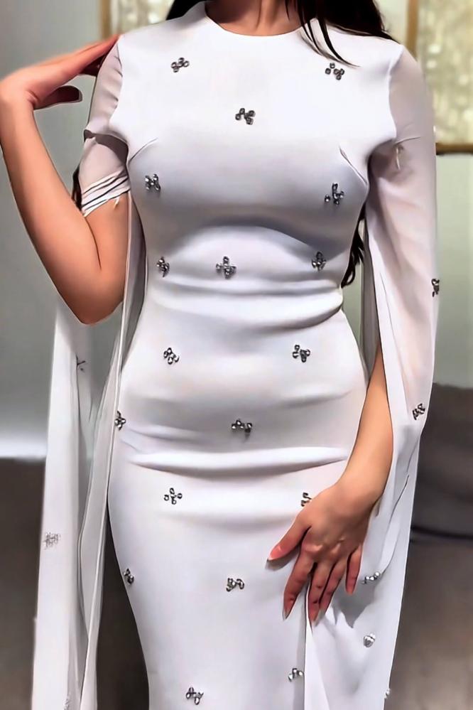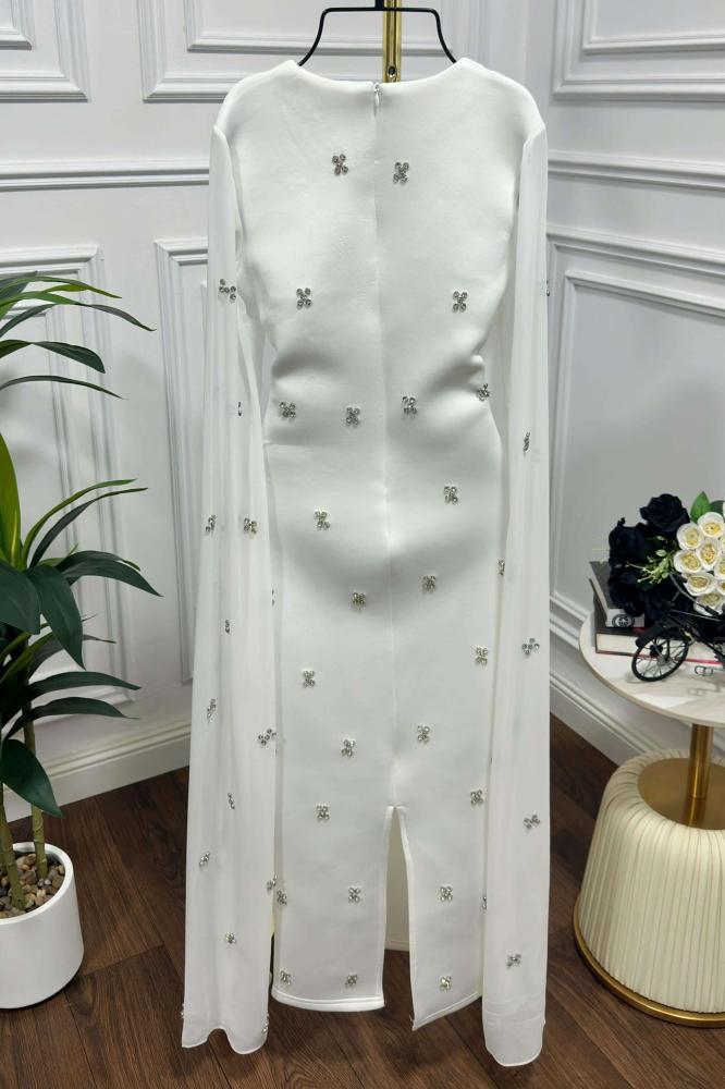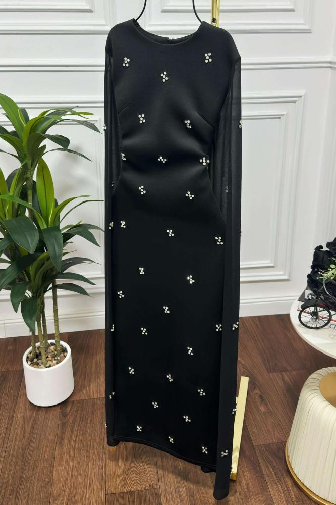 • قماش الفساتين: فستان ميدي ناعم مزين بالكرستال مع أكمام طويلة.